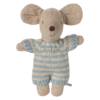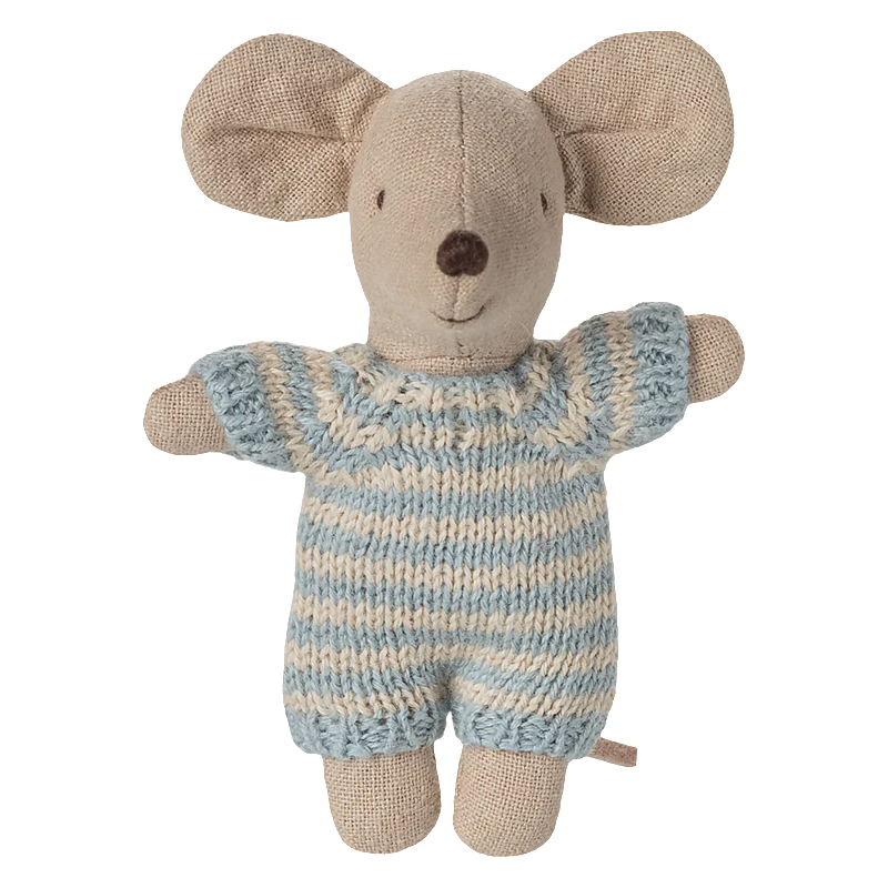 A small baby mouse in a soft and striped knitted suit. It sleeps for hours in its little quilted carry cot.