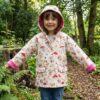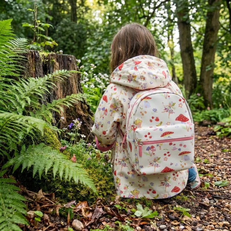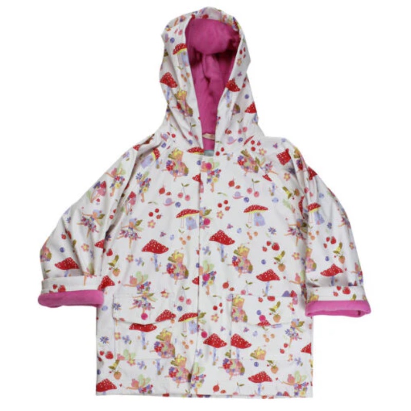 This adorable print has a group of dancing fairies, toadstool houses, flower, fruits and bugs all set against a white background. The coat is lined in a pink towelling to compliment the colours in the print.