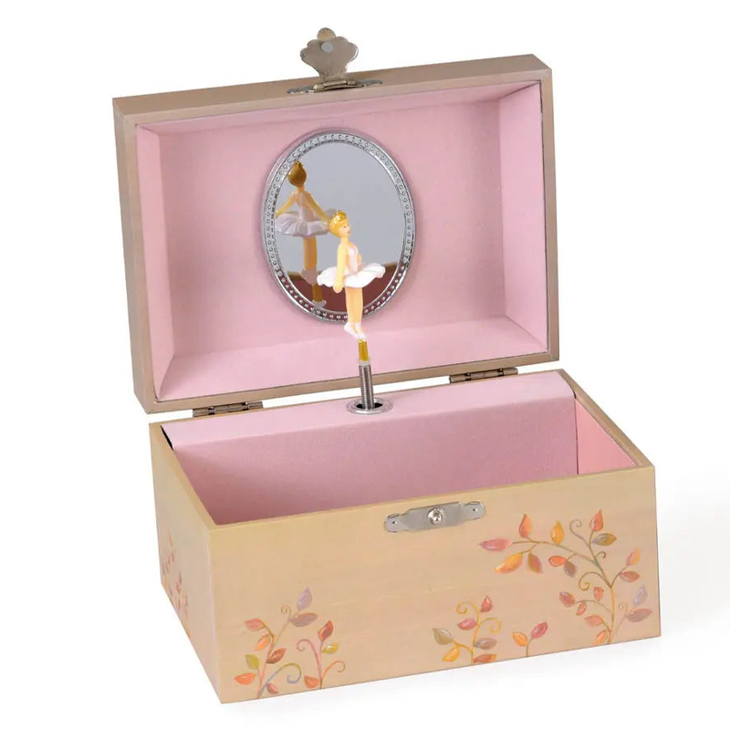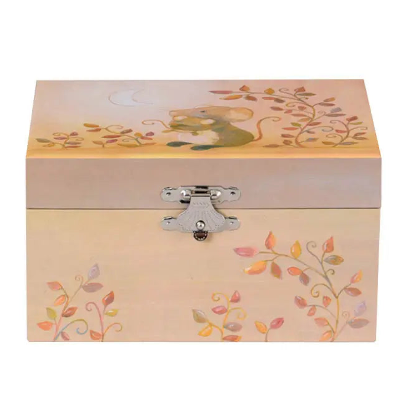 Little hands discover patience as they wind the music box, learning gentle care for precious things. The hand-painted vine motifs bloom across cream wood, whilst soft pink felt cradles treasured keepsakes safely inside.
