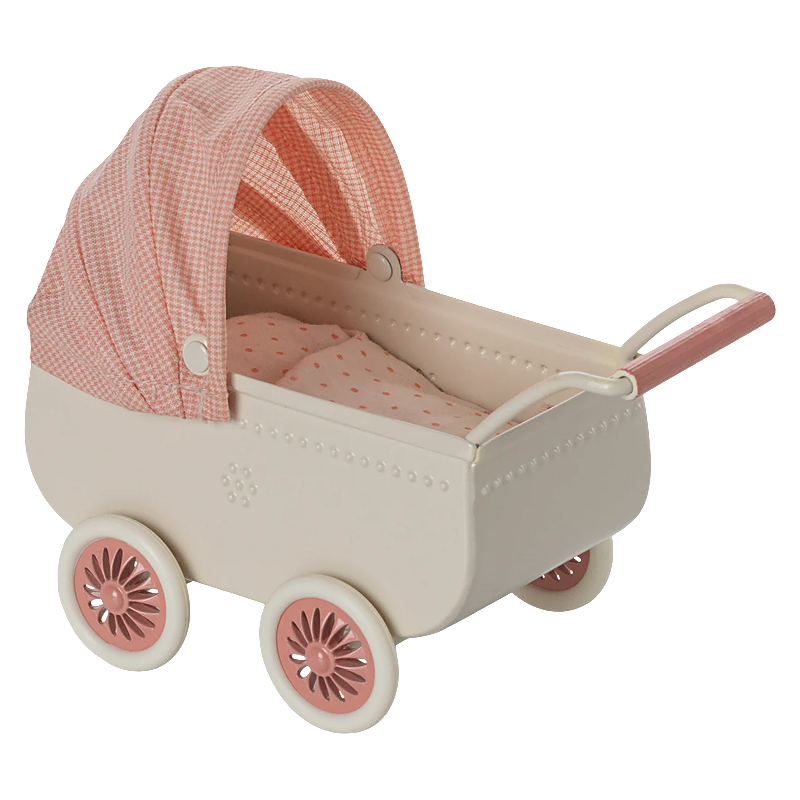 Outside adventuresThe beautiful pram has a vintage look and comes with a small mouse in a sleeping bag. The mouse is laying on a soft mattress in the pram and will sleep for hours.