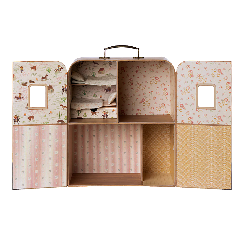 SuitCassaWelcome to SuitCasa – a small portable house. It fits the size: Littlebrother and sister mice. 2 sets of soft bedding for your friends are included but you can buy several of other small furnitures to decorate the house.